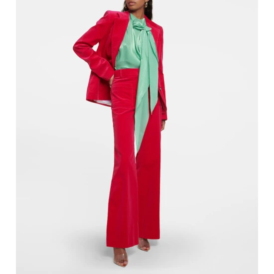 A nod to 70s silhouettes, Victoria Beckham’s signature Alina pants arrive in hot pink velvet this season. The style has a super high-rise waist, flared leg, and two patch pockets.