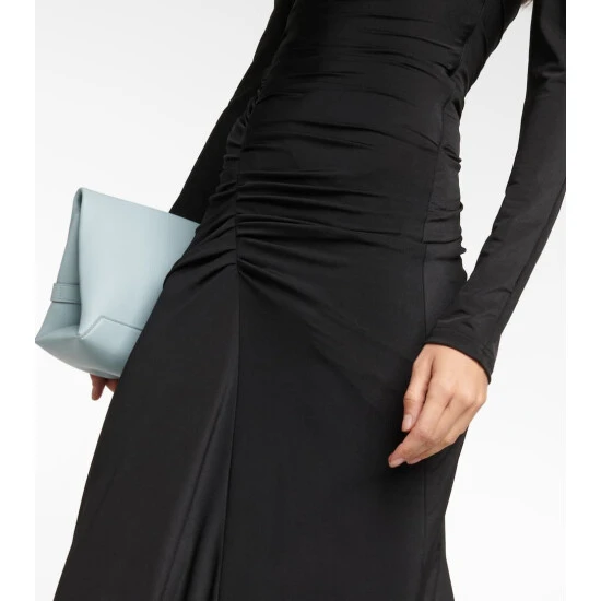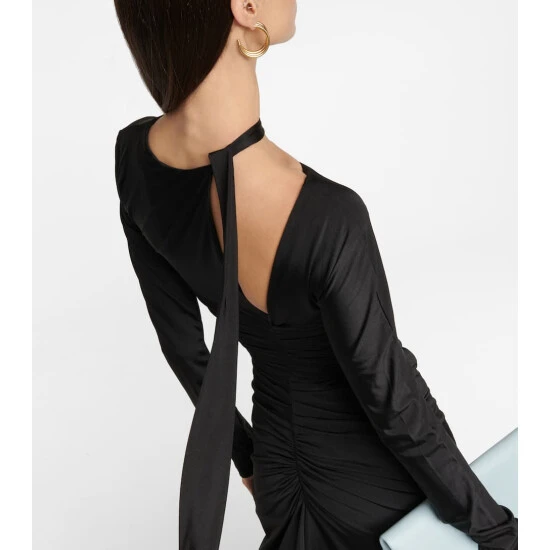 This gown from Victoria Beckham is designed in a floor-length silhouette with ruch-detailing. It’s accented by an eye-catching cutout at the neckline that extends down the back where it is framed by a long tie-detail.