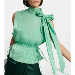 Victoria Beckham’s eponymous label centers around chic, understated styles to create a versatile wardrobe for the modern woman. Defined by a large bow at the high neck, the Tabard crepon top has an iridescent shimmer and a tie detail.